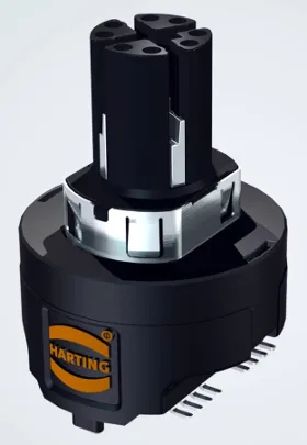 Otra solución de conectividad Ethernet M12 para trenes presentada por HARTING es el conector Han HPR 34 de alta corriente para conexiones de motor, el cual incrementa la densidad de corriente en la parte superior de los segmentos, permitiendo el uso de cuatro contactos HC Modular 650A en un solo conector.