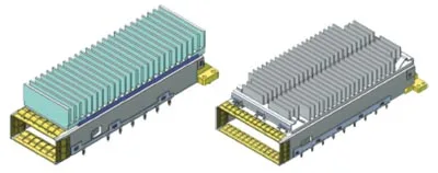 El conector CFP2 está fabricado de un material base de aleación de cobre con un disipador de calor de la aleación de aluminio. La profundidad de la jaula es de 84,5 mm y la altura es de 12,9 mm.