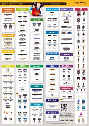 El fabricante DeLOCK ofrece soluciones para prácticamente cualquier aplicación de conexión que se requiera: tarjetas de memoria, SATA, Sub-D, DisplayPort, HDMI, Multiport, mini PCIe, gráficos / vídeo, audio, RF, USB, IDE, DVI, FireWire o Thunderbolt.