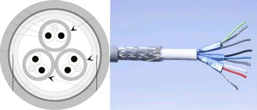 En general, los cables se apantallan para garantizar una correcta insensibilidad ante las interferencias. En la mayoría de los casos, para apantallar los cables se utilizan materiales no magnéticos como cobre o aluminio. Un cable apantallado se compone normalmente de dos juegos de cables trenzados, dispuestos en sentidos opuestos. Este diseño tiene la ventaja de que protege de los campos electromagnéticos y, a la vez, mantiene una alta flexibilidad del cable.