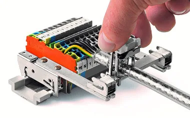 Pulsando los laterales, el resorte se libera, de manera que el terminal de la placa se fija firmemente en el carril.