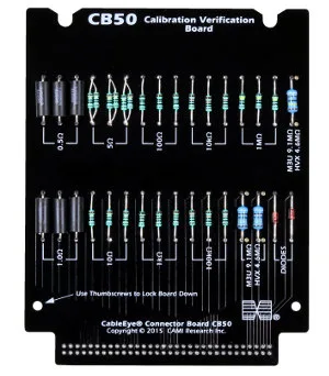 Disponible como single board, la CB50 contiene una red de resistencias de precisión para revisar la resistencia y dos diodos para chequear la polaridad. La tarjeta comprueba diez valores de resistencia diferentes por triplicado en 64 puntos de test de cada cabezal de tester. Los valores abarcan todo el rango de test.